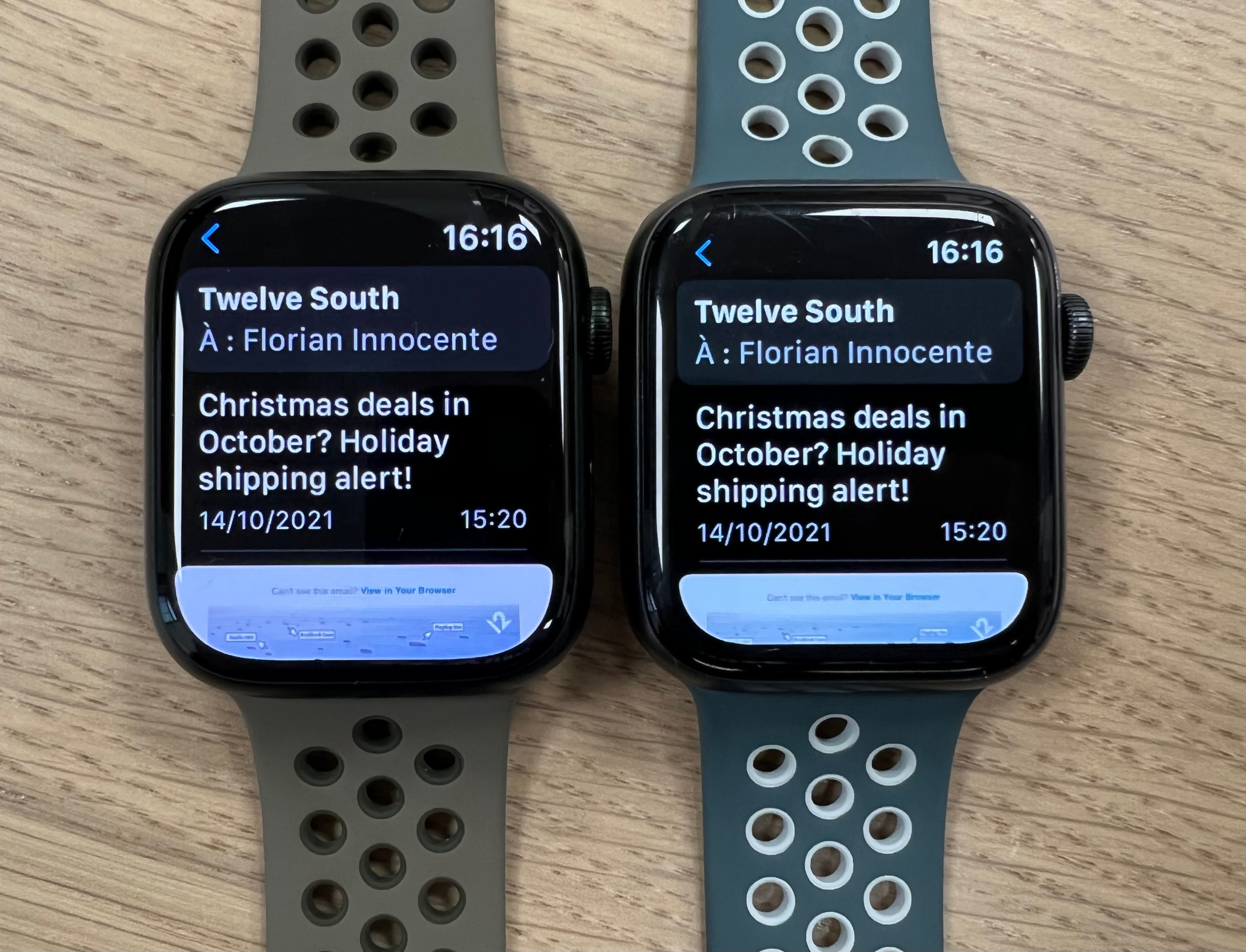 Delivered tomorrow to its first customers and visible the same day in stores, Apple Watch Series 7 arrived a little early. Apple France sent us the model that we have often seen in first tests, namely the 45 mm green aluminum and its Sport band in the same tone. The Nike Sport Band Olive Gray / Cargo Khaki completed the package. So many tones that go well with the season!